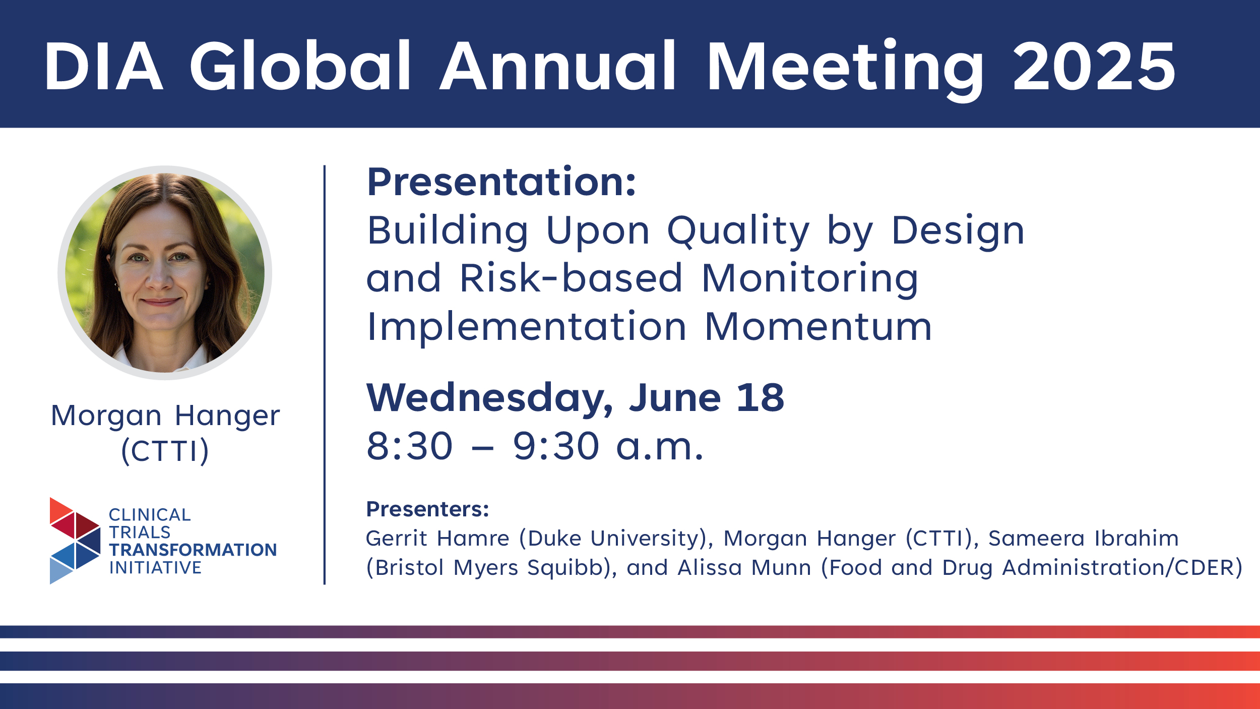 Presenters: Gerrit Hamre (Duke University), Morgan Hanger (CTTI), Sameera Ibrahim (Bristol Myers Squibb), and Alissa Munn (Food and Drug Administration/CDER)